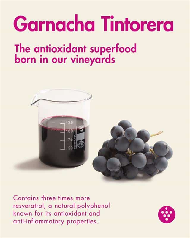 | Vitaminas C, ácido málico y resveratrol. | Prevención de la degradación de las células de la piel. Uso en cosmética o bebidas funcionales con la variedad garnacha tintorera, un súperalimento. |